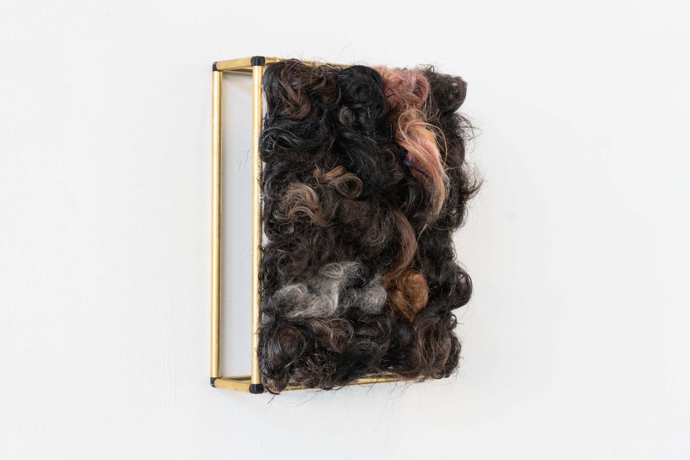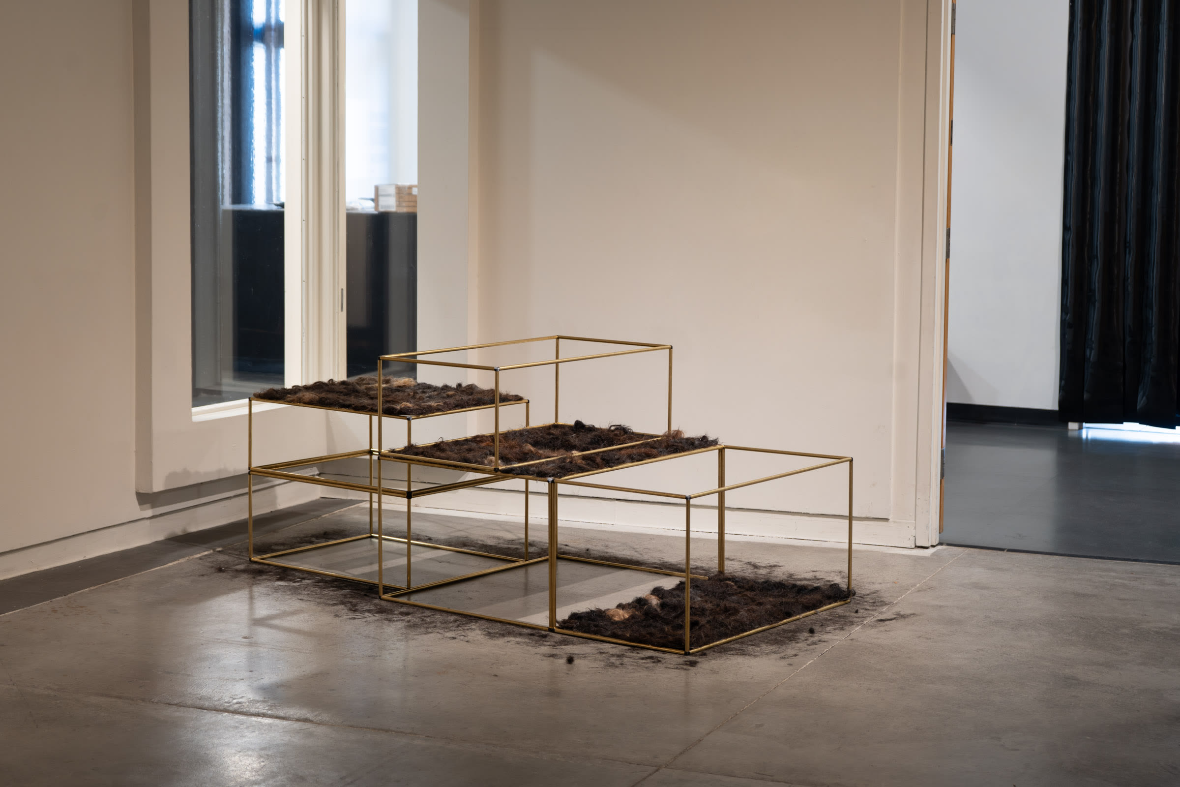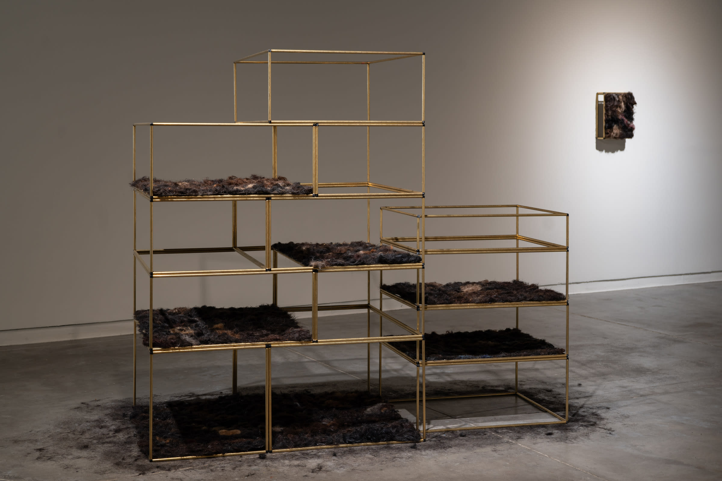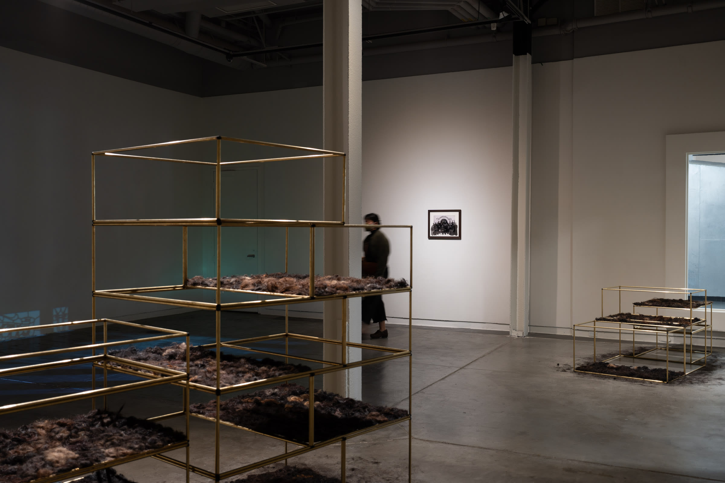 Featured in the exhibition is an installation comprising two towering structures, built from brass tubes, and layered with human hair that were meticulously collected by the artist from several local salons. During his year-long artist-in-residence at GCAC, Lim reached out to more than half of the over 25 salons run by members of the Latino community, all located within a few blocks of the site where Santa Ana’s Chinatown once stood. The hair, a remnant from the community, materializes a cross-temporal and spatial collective memory, weaving together the history ingrained within the people on this land. These unfinished towers reference ceremonial gateways found in traditional Chinese architecture and echo the arches that are often emblematic of Chinatown. Simultaneously, it creates a parallel narrative, juxtaposing the historical migration of the Chinese with the contemporary migration experiences of the Latino communities.