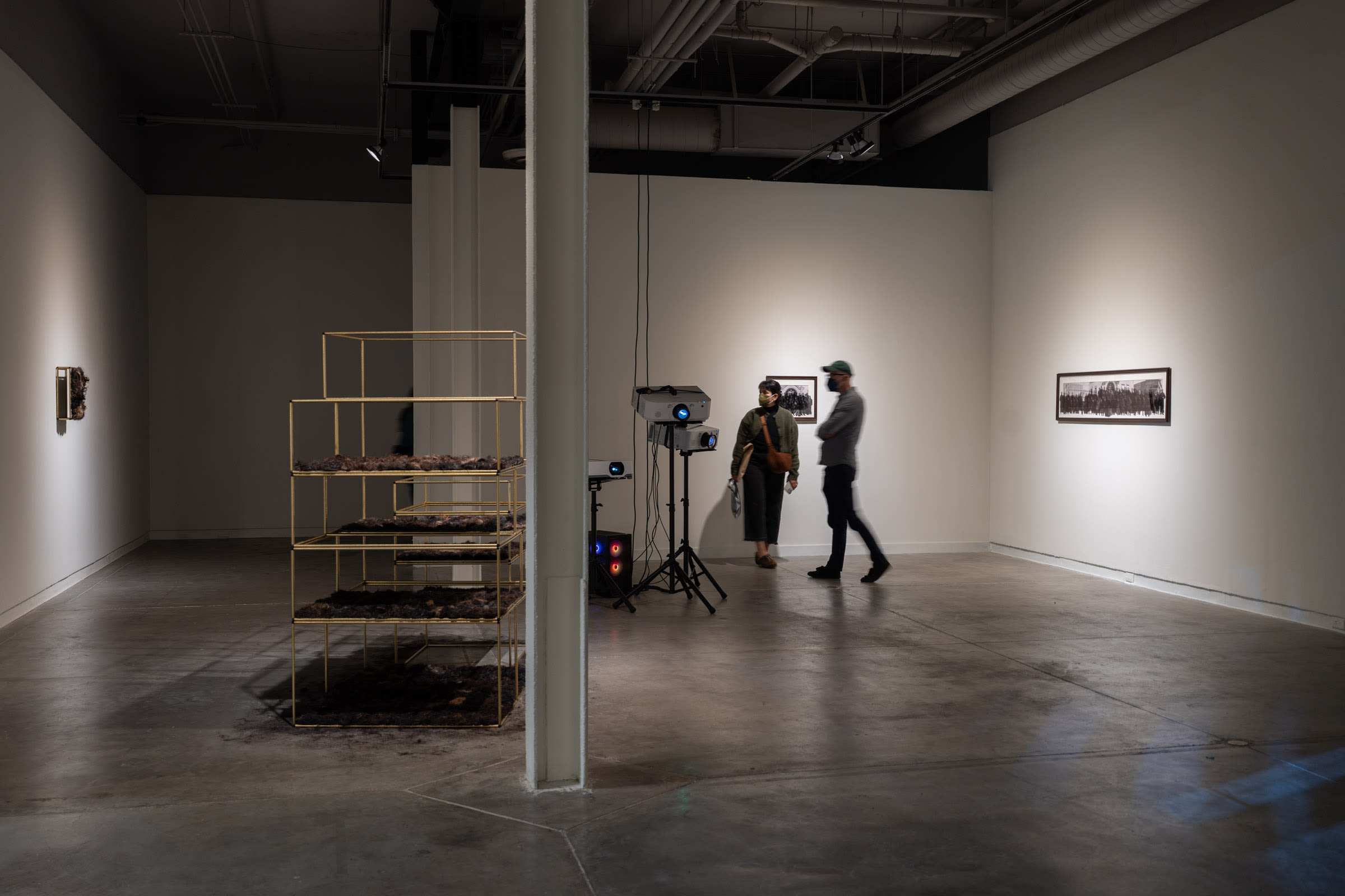 Upon stepping into the exhibition space, one is drawn to a subtle shadow on the floor seemingly cast by an invisible, shape-shifting object suspended in mid-air. Featuring movement of lights, projectors on tripods, and a computer simulating in real time, this installation utilizes projection mapping as a technique as well as a conceptual framework. At certain moments, shadows cast through an unseen doorway recall the original Santa Ana City Hall built in 1904. This installation, propelled by the notion of the perspective machine, delves into the institutionalization of political, economic, and cultural mechanisms. It suggests how these apparatuses may represent a unitary, imperialistic, or colonial worldview, shaping notions of inclusion and exclusion. Considered as performing beings by the artist, this installation invites a critical interrogation into the technical and conceptual aspects of these interrelated apparatuses, haunted by the unseen, suggesting a rethinking of how the past can be perceived and the future can be envisioned.