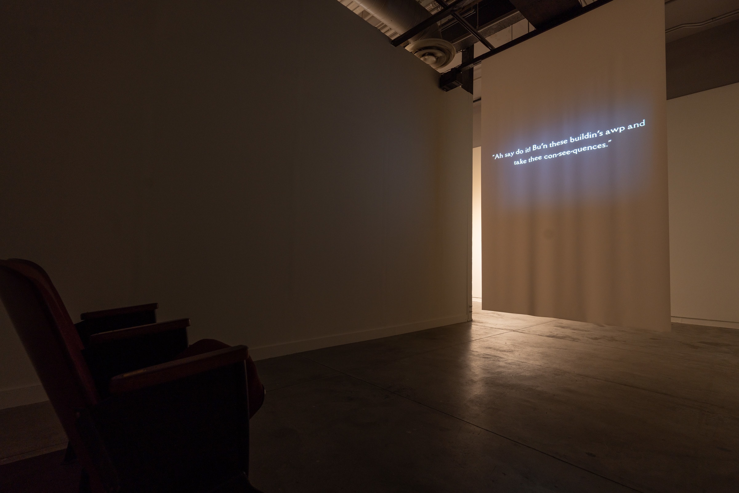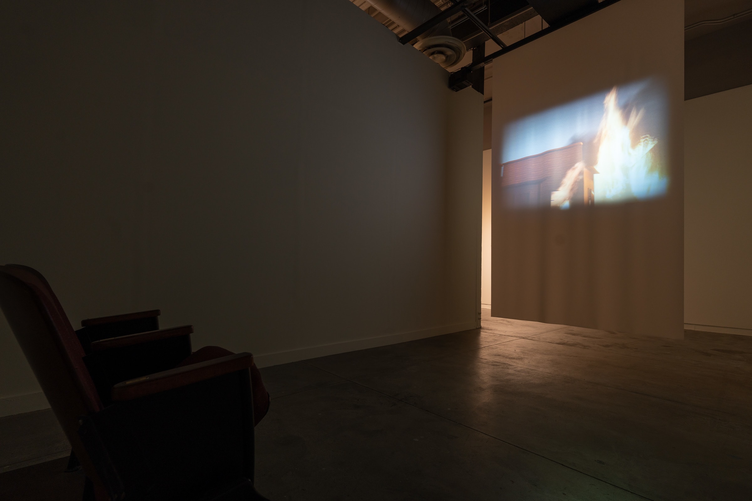 In the back room, the narrative deepens through a video installation. A white screen, suspended from above, cascades like a curtain for the backlit projection of a CGI-rendered fire engulfing Santa Ana’s Chinatown. This digital reconstruction entitled At Night (Santa Ana’s Chinatown) is based on historical maps from the era, as Lim’s extensive research led to a single photograph purported to be of the Chinatown ablaze. Using this as these references, along with other historical data, Lim reenacted the tragic night of the fire. The flames burn in an endless loop, symbolizing a perpetual narrative. Resembling the cinematic style prevalent during the early film industry’s boom, the video includes intertitles derived from archived news articles reporting on the Chinatown. These texts starkly expose the era’s profound biases and racial prejudices, further intensifying the installation’s exploration of memory, history, and the continuous impact of past narratives on the present.